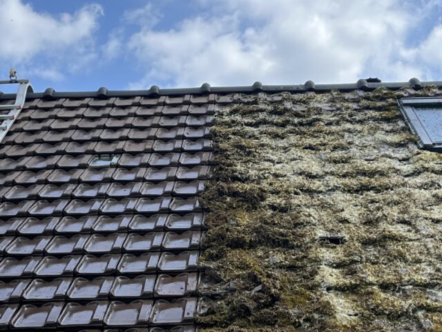 Nous appliquons un produit professionnel qui éradique les racines des mousses en profondeur, garantissant un résultat durablement supérieur aux simples nettoyages.